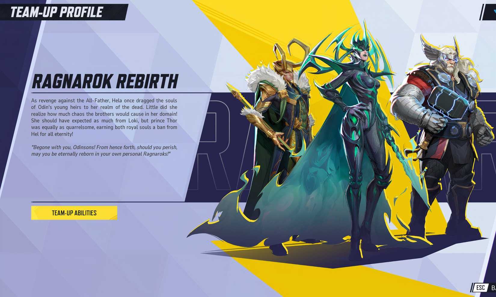 Thor se beneficia enormemente al tener a Hela en su equipo.Estos dos comparten una habilidad de trabajo en equipo con Loki llamada Ragnarõk Rebirth. Cada vez que Hela asesta un golpe final a un enemigo, puede revivirlos instantáneamente a ambos. Si Loki o Thor están vivos, esto les otorga salud adicional.
