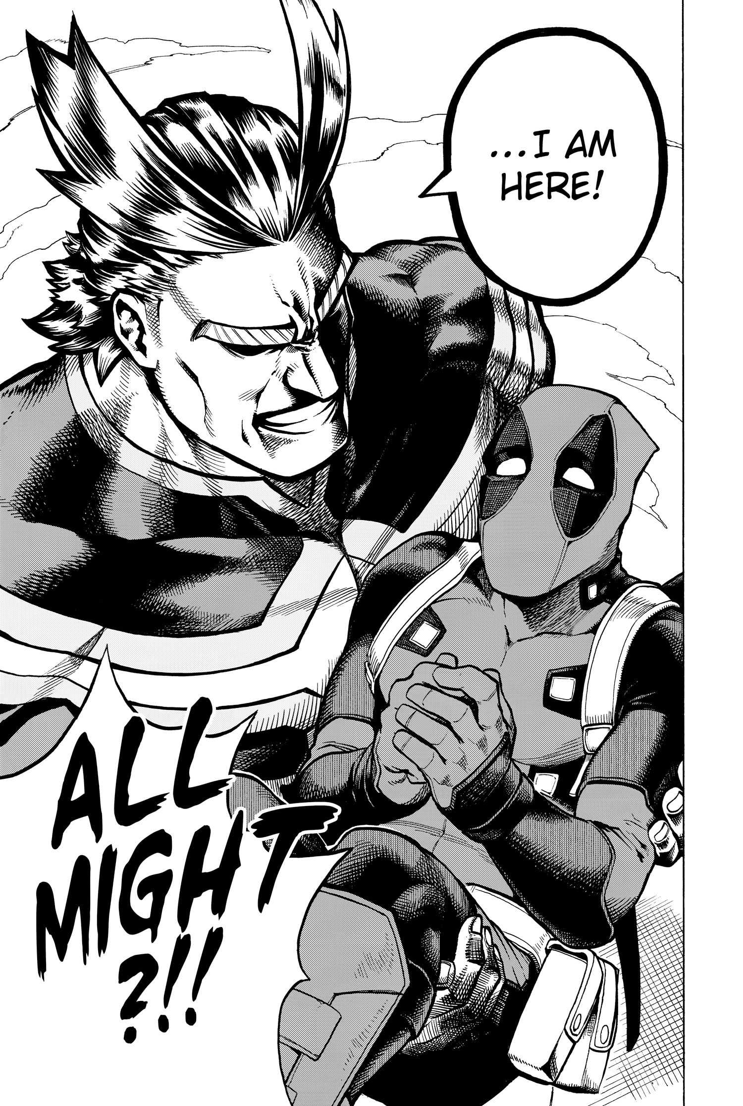 En su momento de necesidad más desesperado, Deadpool saca a un comunicador que puede convocar al héroe más poderoso del vengador. Thanos se lanza para agarrar el dispositivo, enviando accidentalmente la llamada de socorro a otra persona. Dentro de un instante, estalla un explosivo Smash, liberando una ola de choque lo suficientemente poderosa como para enviar a Thanos volando. A medida que el polvo se asienta, Deadpool levanta la vista para ver todo el poder, sosteniendo suavemente el mercenario en sus brazos. Deadpool bromea que secuestra al creador de Mi héroe academia, Koehei Hirokoshi, finalmente valió la pena.