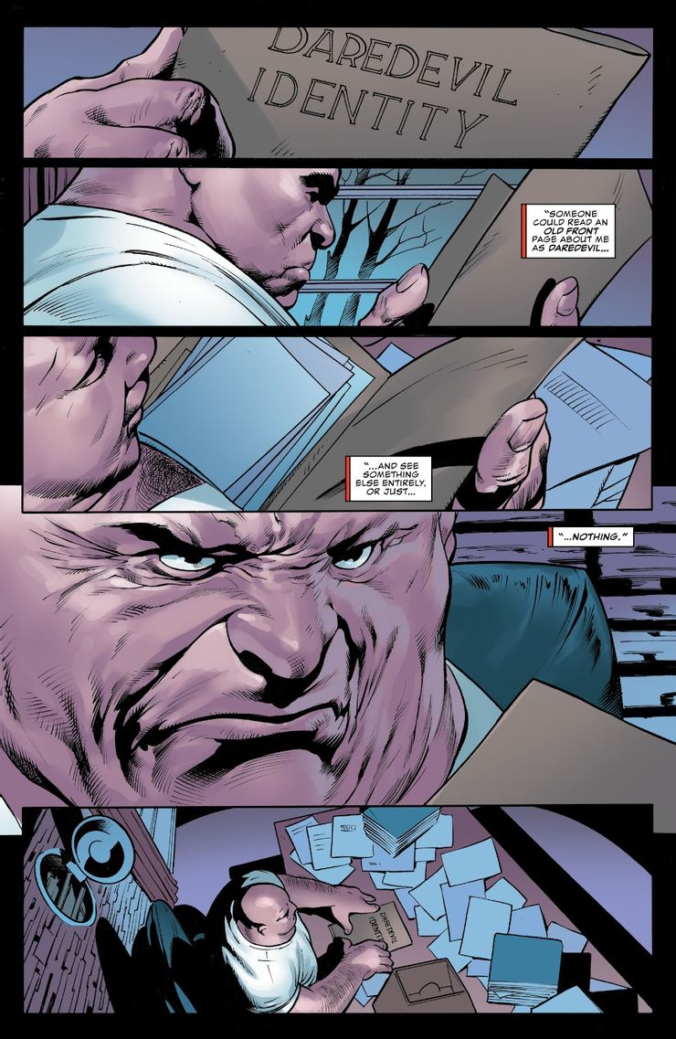 En Temerario # 36, Kingpin, alcalde de Nueva York y ahora recién casado, mira una carpeta en su escritorio. Está marcado como “Daredevil Identity” y tiene varios papeles en su interior. Wilson Fisk mira fijamente el contenido de la carpeta y el lector tiene claro que las páginas en blanco tienen un gran significado para Kingpin. Pero no es hasta Reinado del diablo # 1 que el lector aprenda el verdadero significado del contenido de la carpeta: nada.