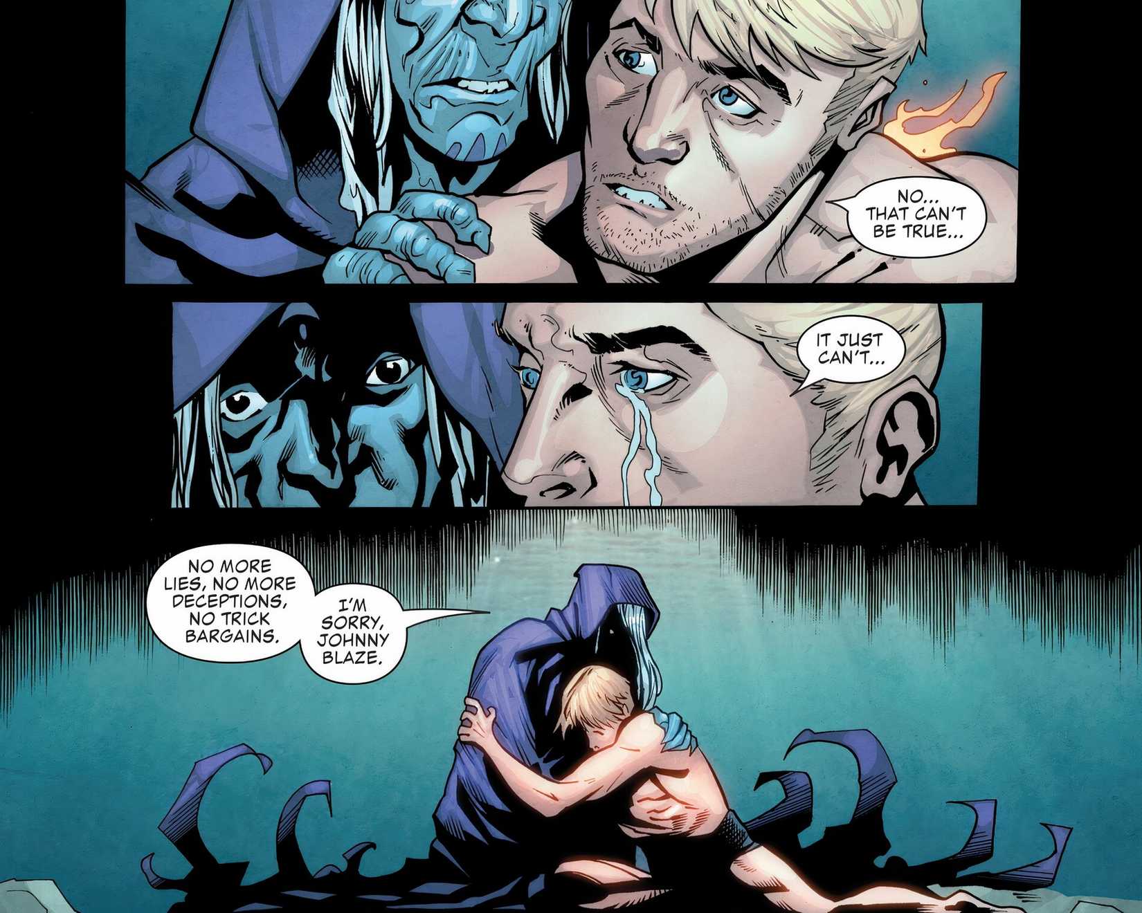 Blaze le promete valientemente a Kauthar que puede manejarlo hasta que la bruja revela que ni siquiera conoce la verdadera naturaleza de los Espíritus de Venganza que lo atan y todos los Jinetes Fantasmas juntos. La bruja se inclina y le susurra al oído a Johnny: causando instantáneamente que el Jinete se desvanezcadejando a Johnny llorando. Al estilo cómico clásico, sus palabras resultan borrosas para el lector, sin embargo, abre espacio para una serie de nuevas teorías. Sorprendentemente, tanto el Motorista Fantasma como otro tomo oscuro comparten vínculos con el reino submarino.