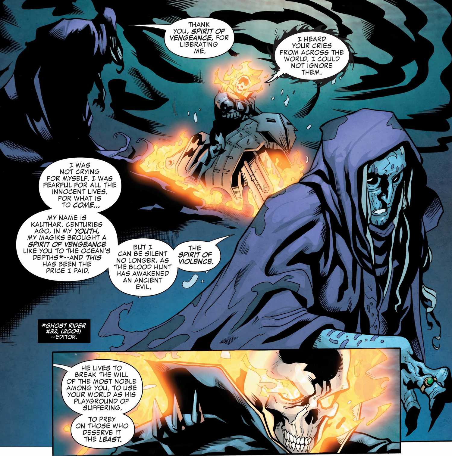 En las profundidades más oscuras del océano, Blaze descubre la fuente del dolor, una bruja del mar llamada Kauthar. Kauthar agradece al Motorista Fantasma y le explica que su encarcelamiento submarino se debió a un compañero Espíritu de Venganza en una época pasada. Ella advierte a Blaze de una nueva amenaza infernal, una Espíritu de violencia, despertado por la caza de sangreliberado para entregar “venganza” a las almas de los inocentes. Sea Hag advierte a Johnny que una vez que el Espíritu de la Violencia encuentre un anfitrión, se volverá imparable.