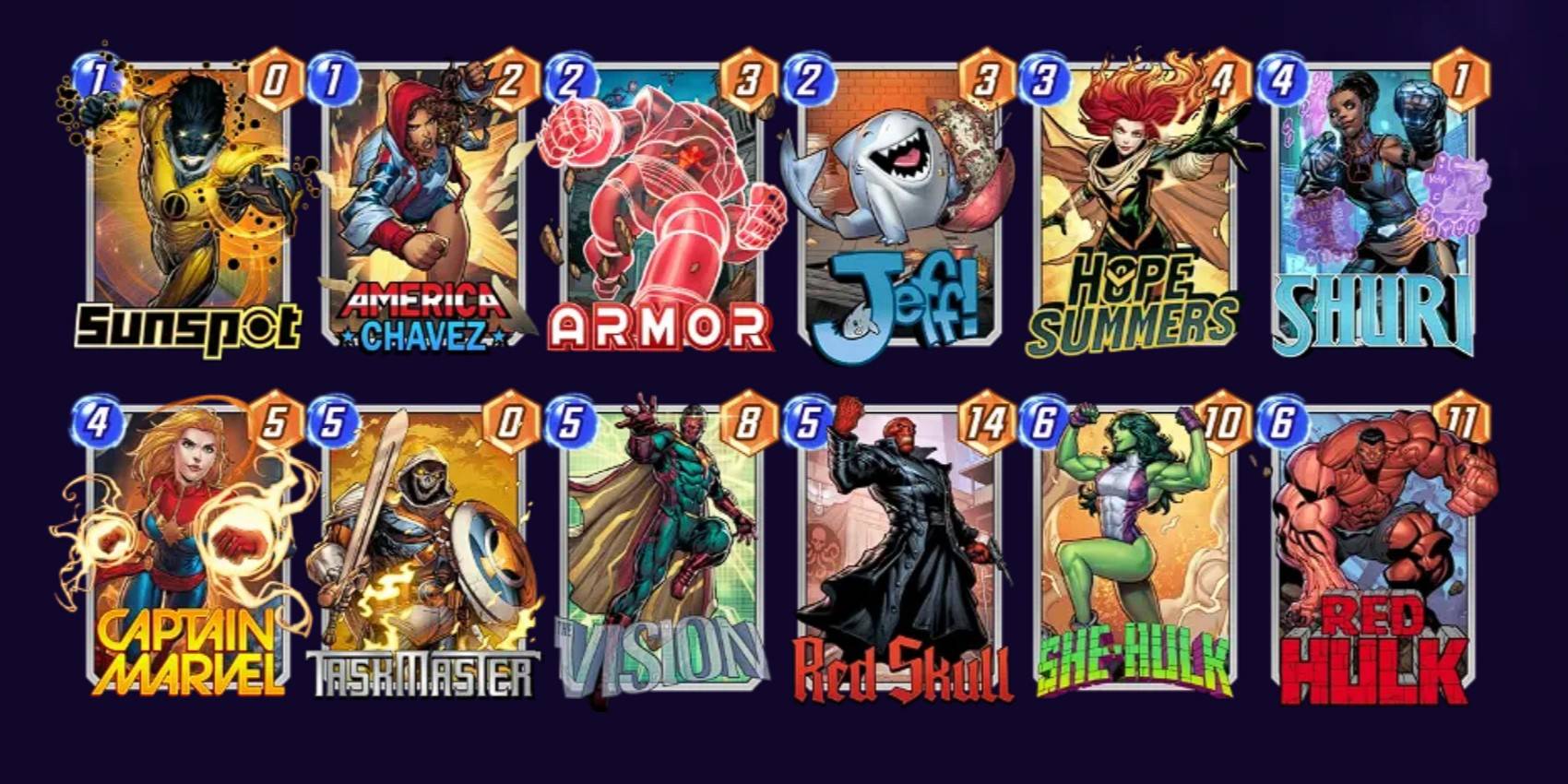 Baron Zemo encaja muy bien en cualquier mazo de molino, especialmente con Cable, y a Red Hulk le gusta estar con otras cartas de alto poder similar, como Shuri.