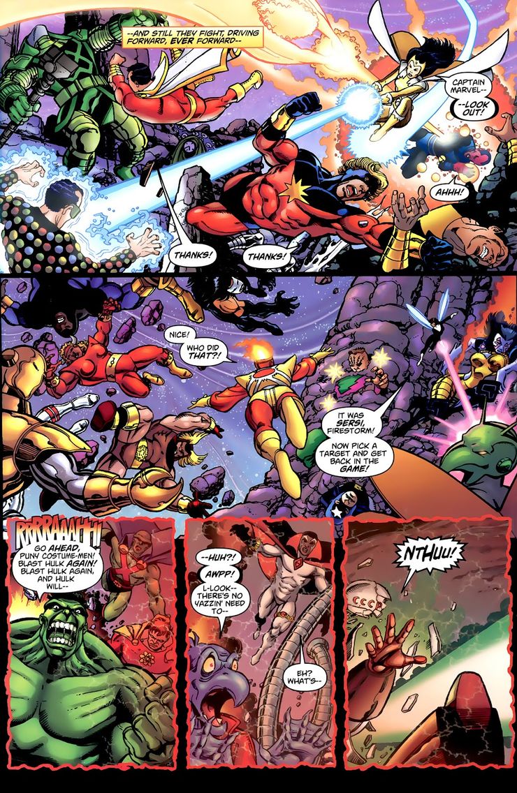 En JLA/Vengadores por George Pérez y Kurt Busiek, los respectivos equipos son peones en un juego que juegan el villano de DC Krona y el villano de Marvel, el Gran Maestro, que consiste en recolectar seis Macguffins famosos de ambos universos. El punto real del crossover fue el mismo que cualquier otro, lograr que dos franquicias icónicas luchen una contra la otra e inevitablemente una al lado de la otra, y en ese frente, el libro cumple, culminando en una batalla épica en los restos huecos de Galactus. En el número 4, mientras los Vengadores y la Liga de la Justicia unen fuerzas para enfrentarse a todos los villanos imaginables a los que se han enfrentado, los fanáticos disfrutaron de una broma de Capitán Marvel perfectamente sincronizada en medio de todo el caos.
