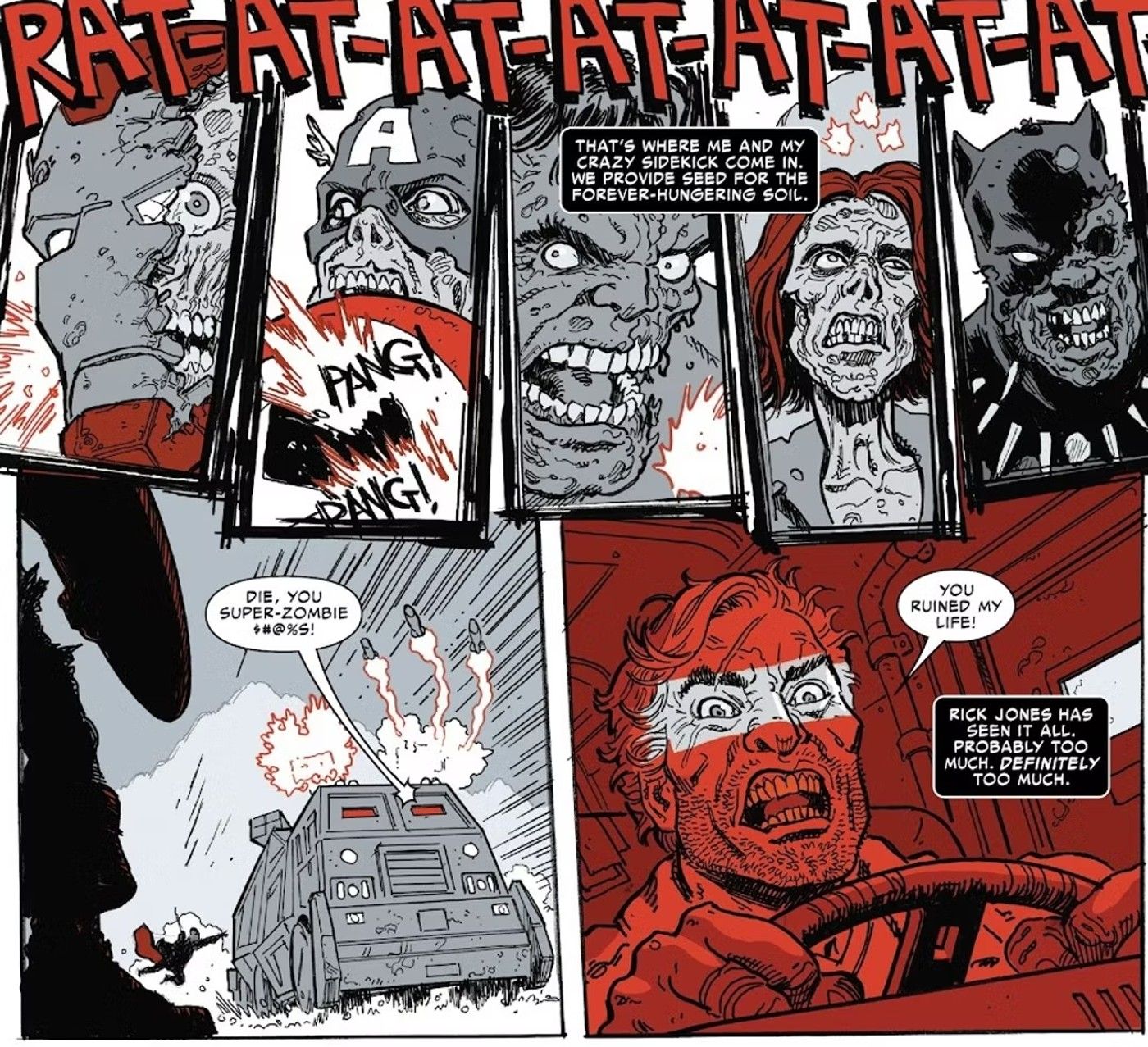 Curiosamente, los Vengadores, a pesar de haberse convertido en criaturas de la noche sin sentido, todavía tienen los medios para unirse como equipo, hasta un Capitán América zombificado que aparentemente grita: “Vengadores unidos!” en lenguaje zombie.