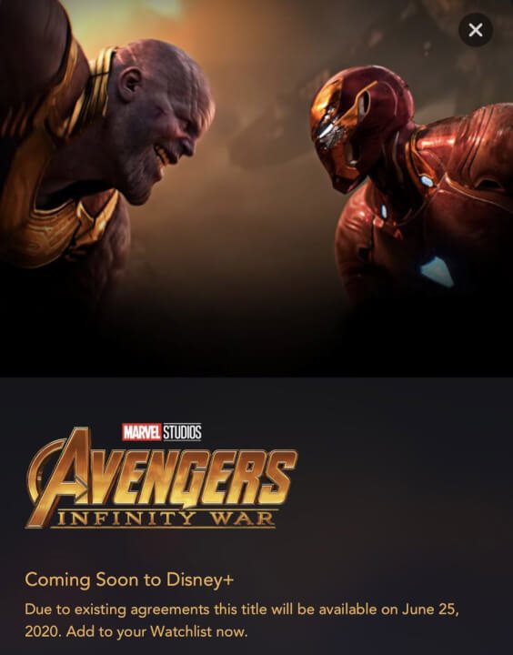 Ya hay una página para Infinity War en Disney + que en realidad establece que debido a las negociaciones contractuales existentes no se está transmitiendo actualmente. Esto también confirma nuestro calendario de eliminación de cuándo el título está programado para salir el 25 de junio de 2020.