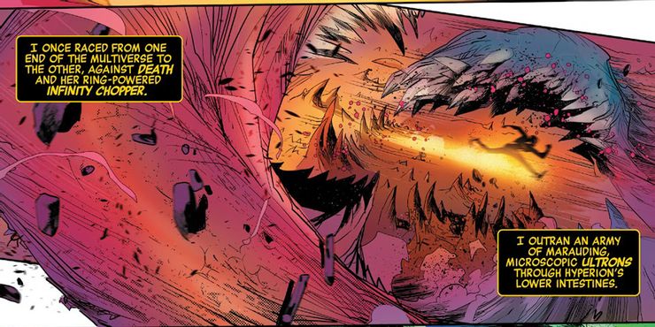 La Héroes renacidos El universo es un mundo de Marvel como ningún otro. Los Vengadores dejan de existir, ya que los héroes más grandes han seguido caminos diferentes: Thor se convierte en un Athiest bebedor, Black Widow se une a un equipo de villanos junto a Hawkeye, mientras que Hulk es desterrado a la Zona Negativa después de perder el control por primera vez (lo haría luego ser asesinado). Los nuevos héroes a cargo son el Escuadrón Supremo, que originalmente se basó en la Liga de la Justicia de DC. Uno de esos héroes, Blur, es el pastiche de Flash de Marvel. Se revela que Blur se ha enfrentado a algunos villanos increíblemente poderosos, incluido el Death con poder de anillo que usaba un Infinity Chopper.
