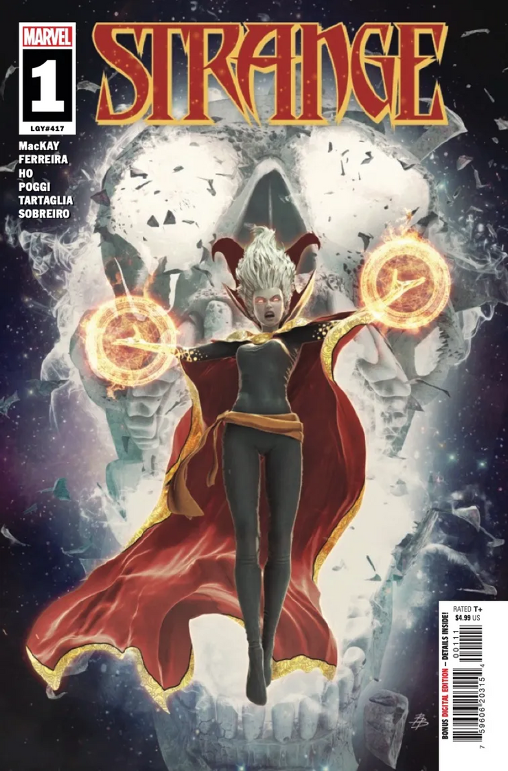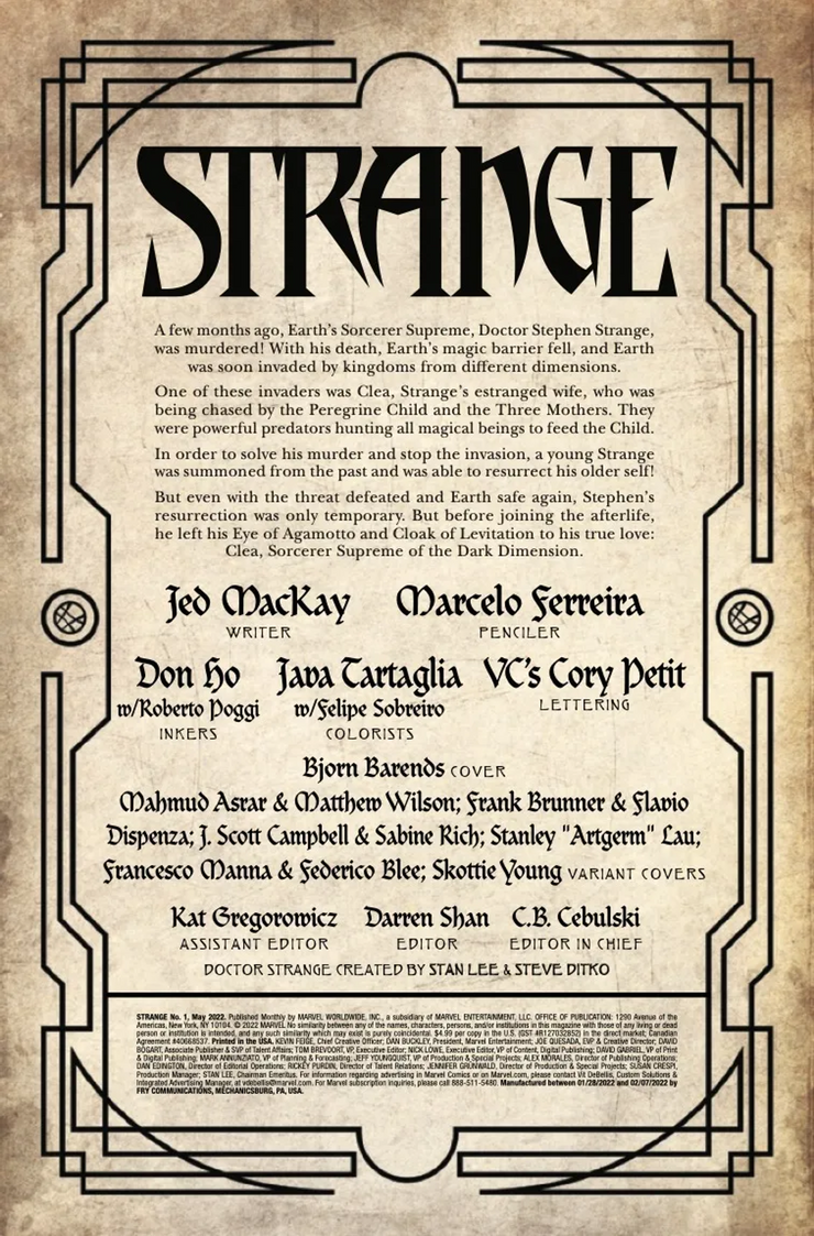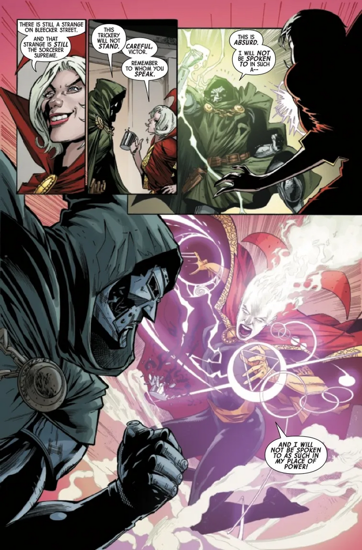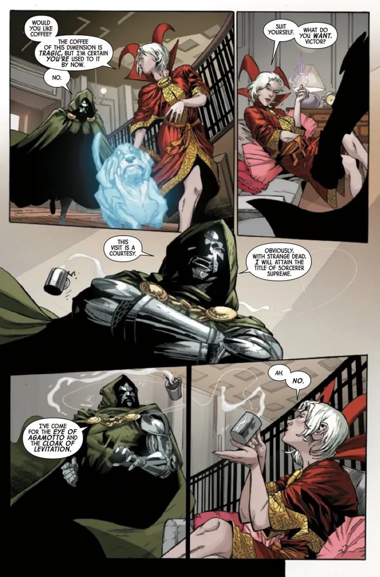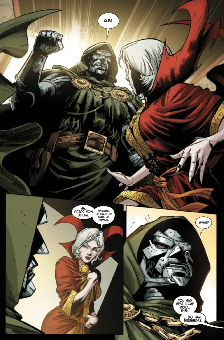 La previa de Jed MacKay y Marcelo Ferreira Extraño #1 abre con una Clea enfadada por unos golpes en la puerta del Sanctum Sanctorum. El Doctor Doom irrumpe, un acto que aterrorizaría a la mayoría, pero Clea está fuera de fase y, en cambio, lo invita a entrar. Doom declara que el título de Hechicero Supremo es suyo y amenaza a Clea con su magia. Al ser la sobrina de Dormammu, no reacciona como los fanáticos podrían esperar cuando se enfrenta a uno de los villanos más imponentes de Marvel.