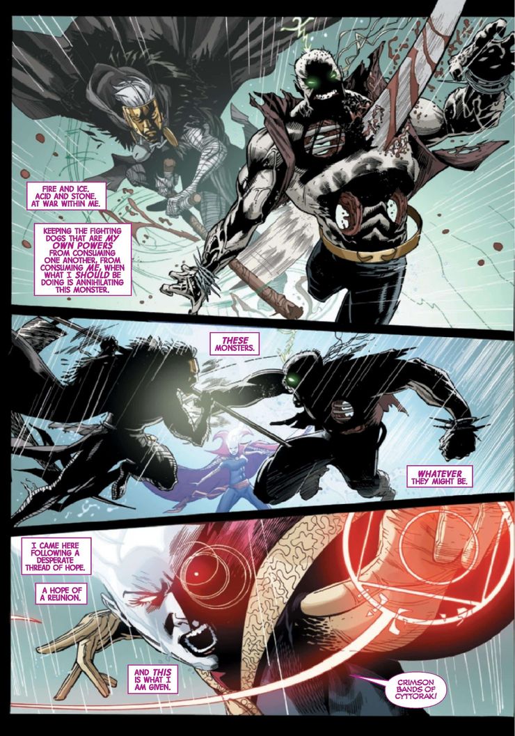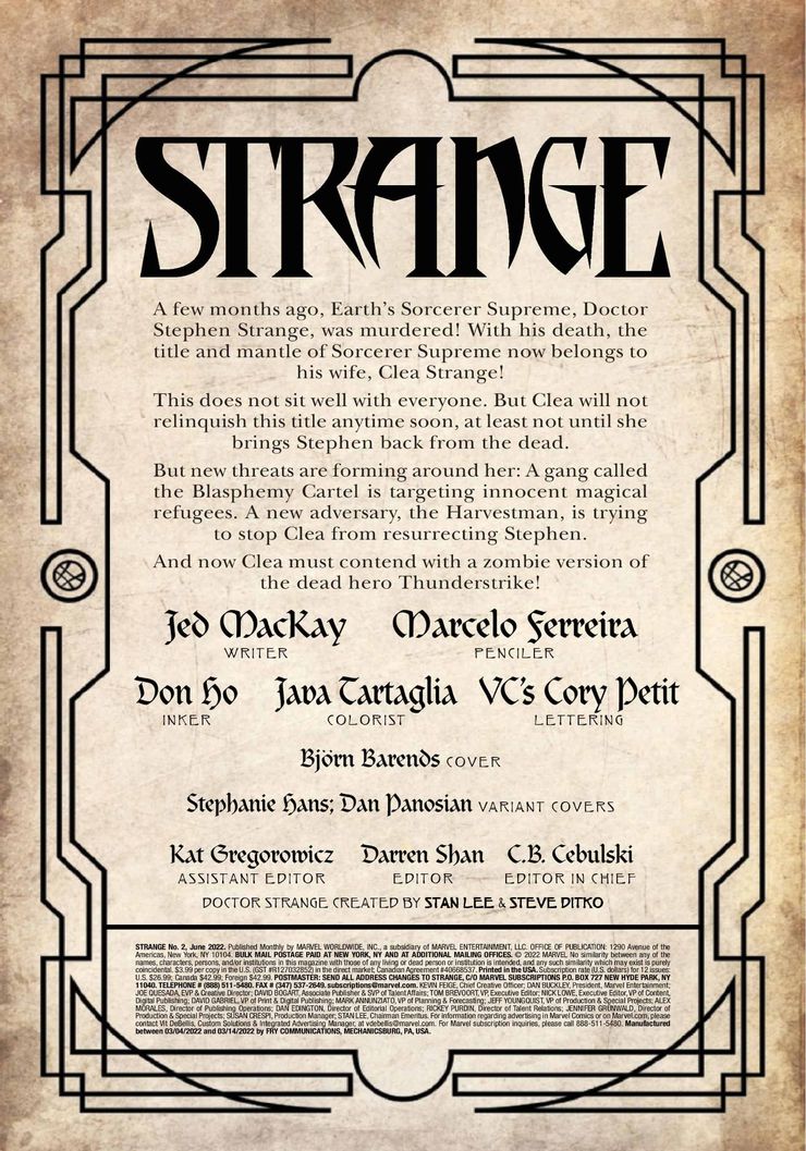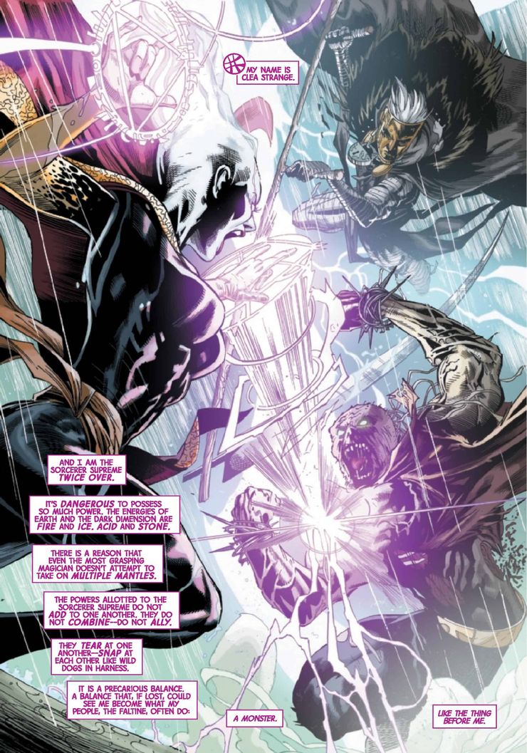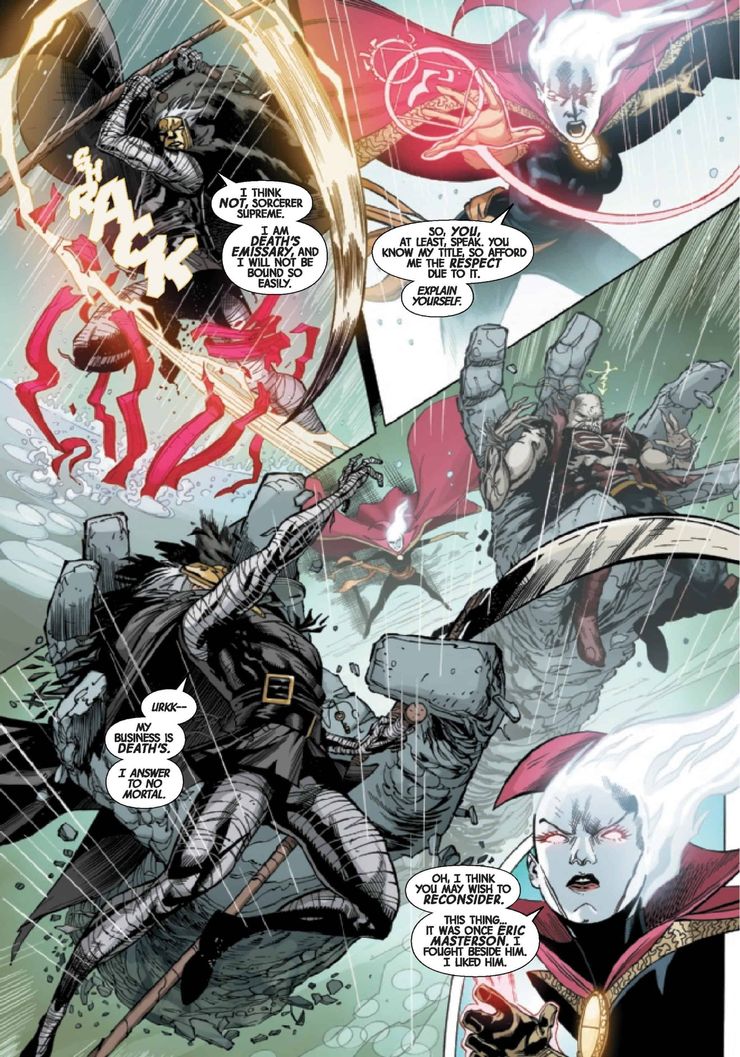 Clea agrega que los poderes en conflicto están en guerra dentro de ella, ya que rápidamente logra que no se conjuguen entre sí cuando debería concentrarse en luchar contra el Thunderstrike zombificado. Harvestman le dice al nuevo Hechicero Supremo de Marvel que su negocio es “de la muerte” y que responde a “ningún mortal”. Clea le pide que reconsidere, mientras admite que luchó junto a Thunderstrike antes cuando él estaba en su forma más humana.