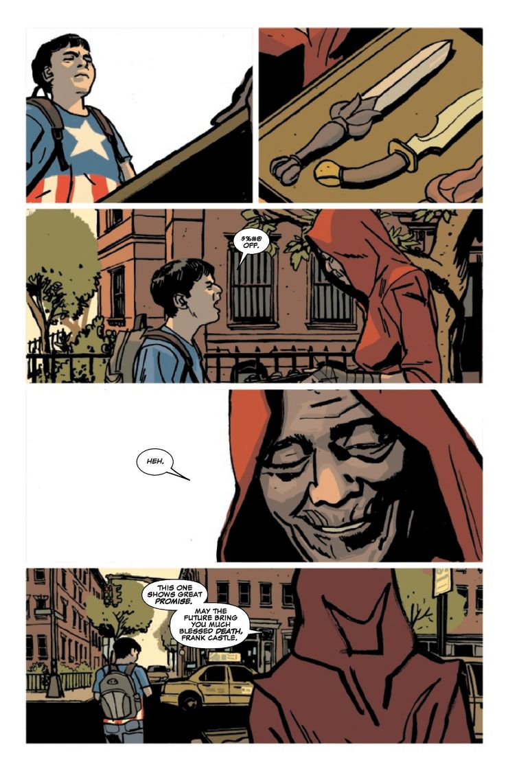 Frank Castle ya no es un lobo solitario a la caza de criminales, sino que ha sido reclutado por la Mano, la secta de asesinos ninja que suele aparecer en las historias de Daredevil. La Suma Sacerdotisa de la Mano cree que Frank es el Puño de la Bestia, la criatura demoníaca adorada por la secta y el elegido que será el mayor asesino de todos los tiempos. En Castigador #2, escrito por Aaron con arte de Jesús Saiz, Paul Azaceta y Dave Stewart, hay una revelación aún mayor que cambia por completo el pasado y los orígenes del personaje. En lugar de desarrollar la personalidad mortal de Punisher después de presenciar el asesinato de su esposa e hijos, Frank tenía instintos peligrosos desde que era un niño, se metía en peleas, coleccionaba cargadores de armas e incluso mataba a un hombre antes de los 12 años. La suma sacerdotisa observó sobre Frank, e incluso se acercó a él en al menos una ocasión, de una manera muy similar a como lo hizo la Muerte con Thanos.