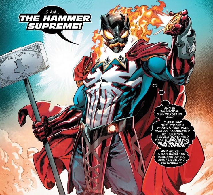 El héroe en cuestión es conocido como el Martillo Supremo que hizo su primera aparición en guerras infinitas # 3 por Gerry Duggan y Mike Deodato Jr. Después de que se formó Warp World, un terremoto de realidad golpeó la ciudad de Nueva York y fusionó Ghost Hammer y Spider Supreme, un evento que creó Hammer Supreme. Si bien en la superficie parece que Hammer Supreme es solo la combinación de dos héroes alterados, tanto Ghost Hammer como Spider Supreme tenían una cantidad de poderes de los Vengadores almacenados dentro de sus respectivos cuerpos. Ghost Hammer es la combinación de Ghost Panther (Ghost Rider fusionado con Black Panther) y Iron Hammer (la combinación de Iron Man y Thor). Spider Supreme es la combinación de Arachknight (Spider-Man fusionado con Moon Knight) y Soldier Supreme (Capitán América y Doctor Strange).