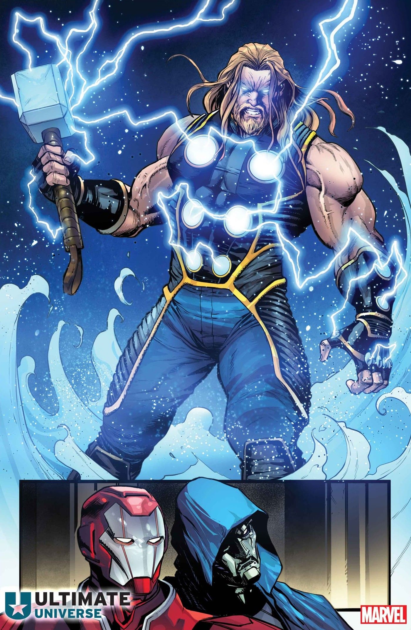 En una vista previa del cómic compartido por Marvel, los fanáticos ven a Iron Lad de Tony Stark enfrentándose al villano con espada Henri Dugarry, además de explorar una estructura junto a Thor, Sif y el Doctor Doom (Reed Richards de esta realidad). Capitán América. recientemente rescatado por Reed y Tony, completa lo que parece ser el debut de los Vengadores en este mundo.