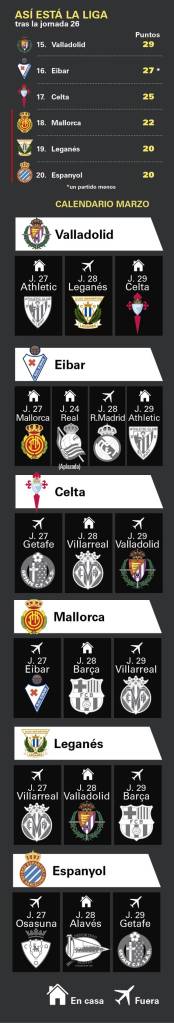 El Espanyol debe hacer los deberes y obtener buenos resultados en estos compromisos. Eso es lo primordial. Pero a la vez también mirará de reojo a lo que hagan sus contrincantes en esto de la lucha por la permanencia. Leganés, Mallorca, Celta, Eibar y Valladolid son aquellos a los que se les podría dar caza tras estas jornadas 27, 28 y 29 al encontrarse a 9 puntos o menos. Y ninguno de ellos tiene un calendario más favorable sobre el papel que el del Espanyol. Con el plus de que tendrán lugar enfrentamientos directos como el Eibar-Mallorca, el Leganés-Valladolid y el Valladolid-Celta que facilitan que, si hacen sus deberes, los de Abelardo tengan garantizado recortar distancias.