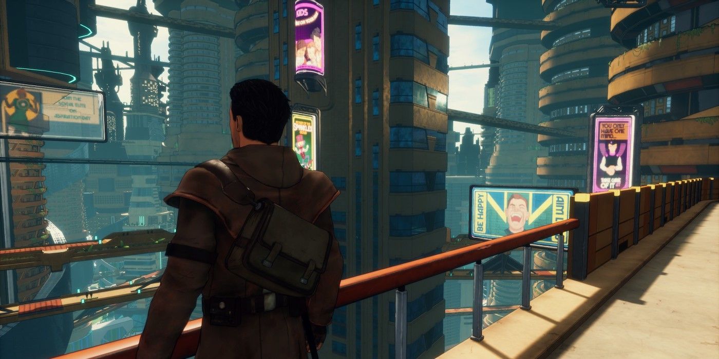 En cambio, el enfoque en Más allá de un cielo de acero es algo lineal, con segmentos de la ciudad que se desbloquean a medida que los jugadores avanzan en la narrativa, lo que lleva a Robert en un viaje relativamente corto. Los acertijos ligeros constituyen el núcleo del tiempo del jugador en Union City. No hay tantas ubicaciones en sí, pero cada ubicación le da al jugador una idea de la escala y estratificación de la ciudad. Hay seriedad en gran parte del diálogo del juego más adelante en la historia, pero los enormes descubrimientos narrativos se ven obstaculizados por una actuación de voz mediocre y expresiones faciales atrofiadas.