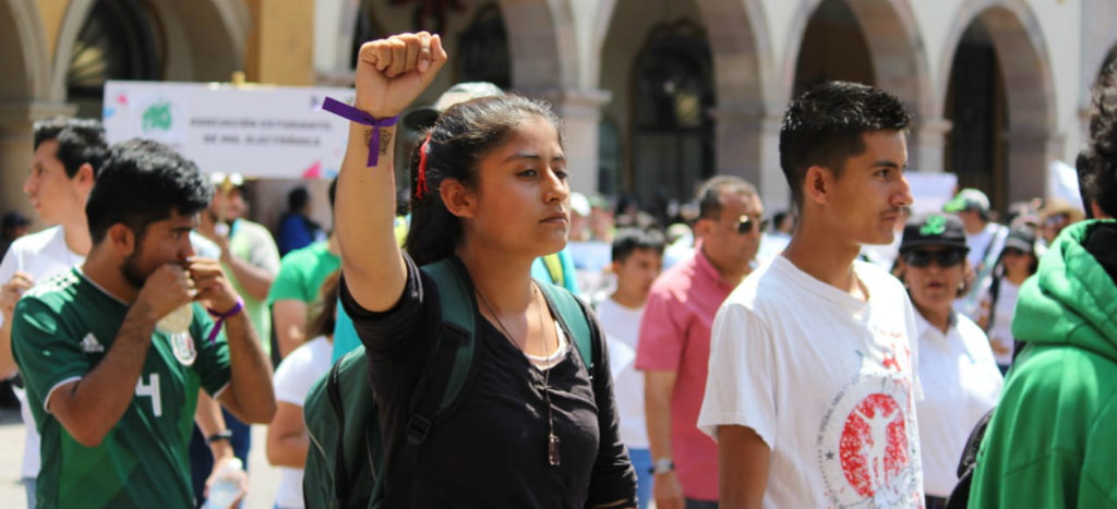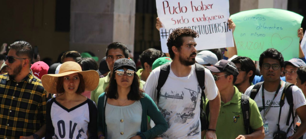 Los contingentes avanzaron cerca del medio día por la avenida Insurgentes con dirección a Presidencia Municipal, donde ya los esperaban estudiantes de la ENMS por la cercanía de la escuela con el edificio de Ayuntamiento.