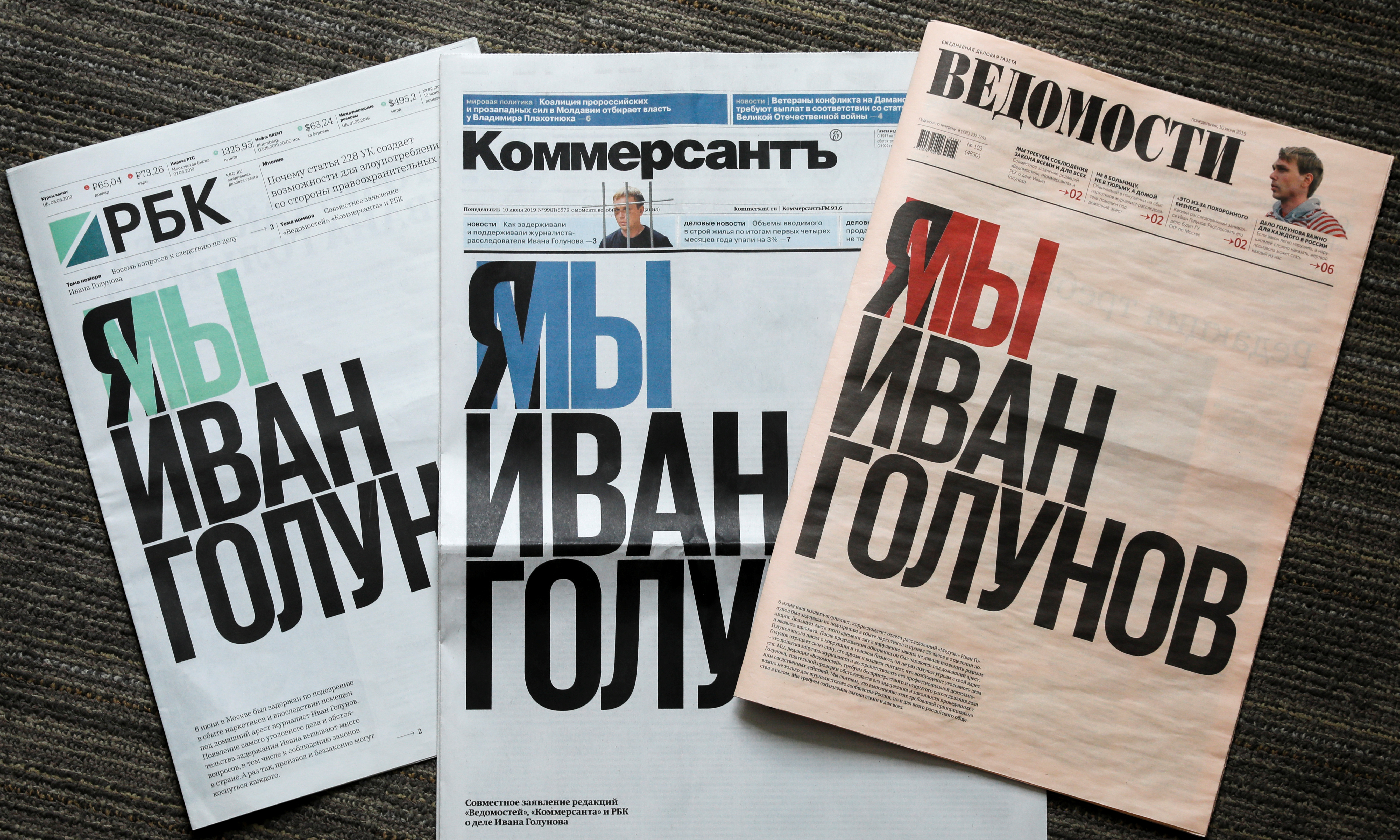 Los principales periódicos de Rusia (I a D) RBK, Kommersant y Vedomosti, publicaron la misma portada en apoyo al periodista Iván Golunov tras su detención. “Yo soy/Somos Iván Golunov”, se lee en los encabezados (Foto: REUTERS/Shamil Zhumatov)