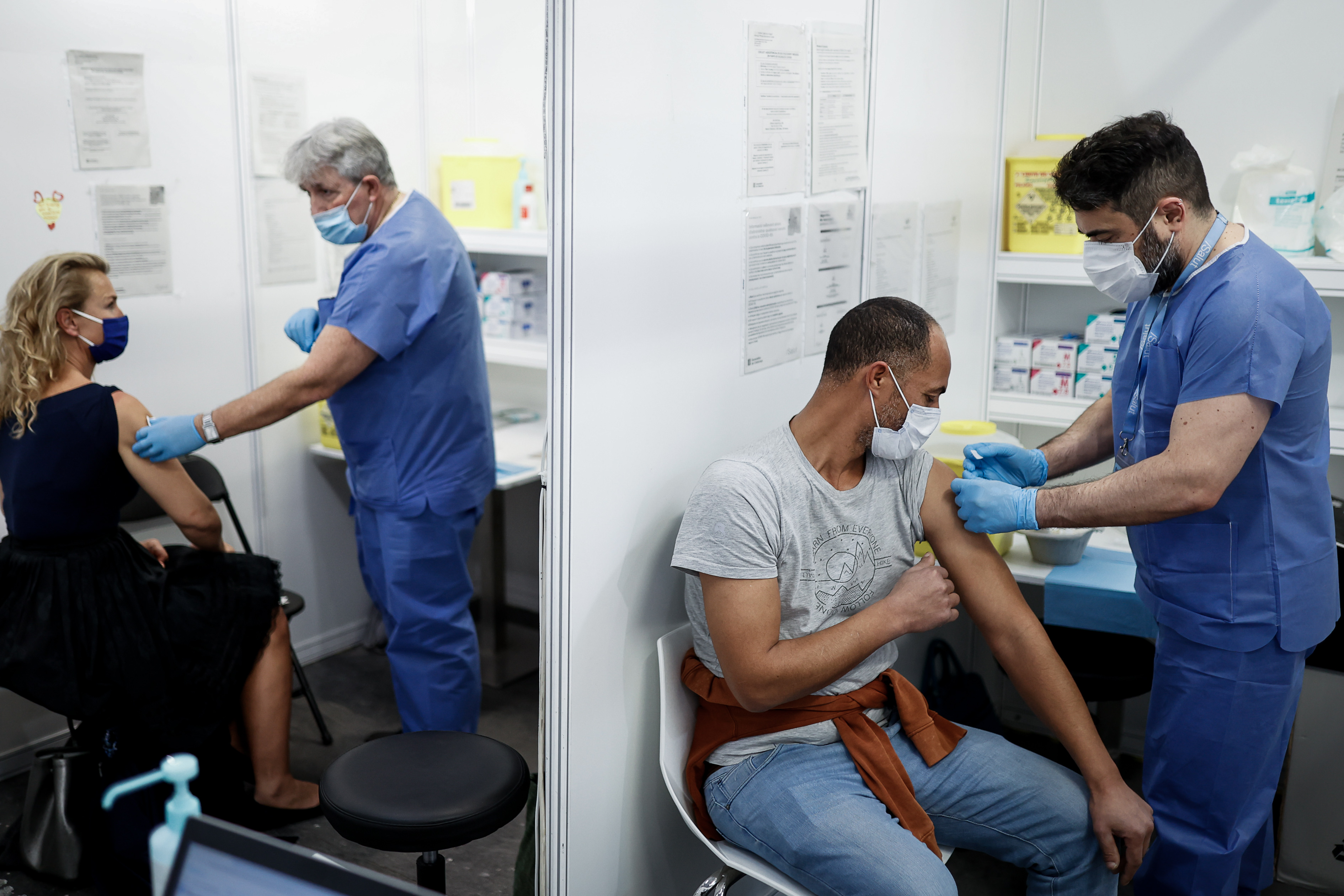 Punto de vacunación en el recinto de Montjuic de la Fira de Barcelona, este lunes.Albert Garcia