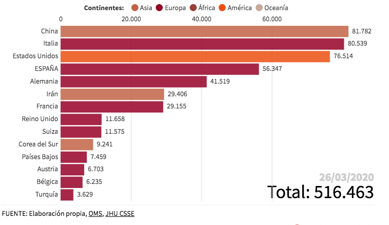 Los contagios por el nuevo coronavirus Covid-19 son ya más de 515 mil en 187 países del mundo.