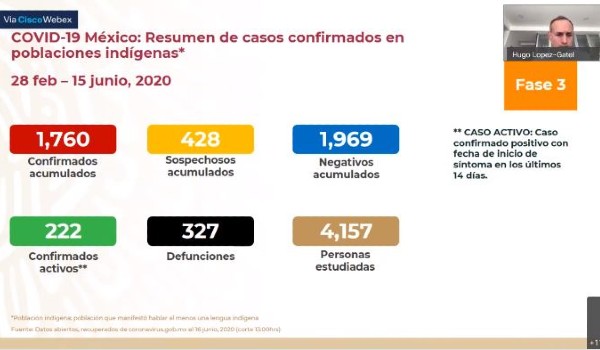 El subsecretario de Prevención y Promoción de la Salud de la Secretaría de Salud, Hugo López-Gatell, informó que se han confirmado mil 730 casos de Covid-19 y han muerto 327 en poblaciones indígenas.