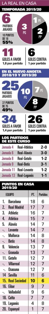 La temporada pasada fue cruel en este sentido porque los donostiarras únicamente obtuvieron siete victorias en 19 encuentros ante su gente, por fin cerca. Los últimos visitantes de Anoeta del año 2019 serán Eibar y Barcelona. Oportunidad de oro para enderezar el rumbo en casa.