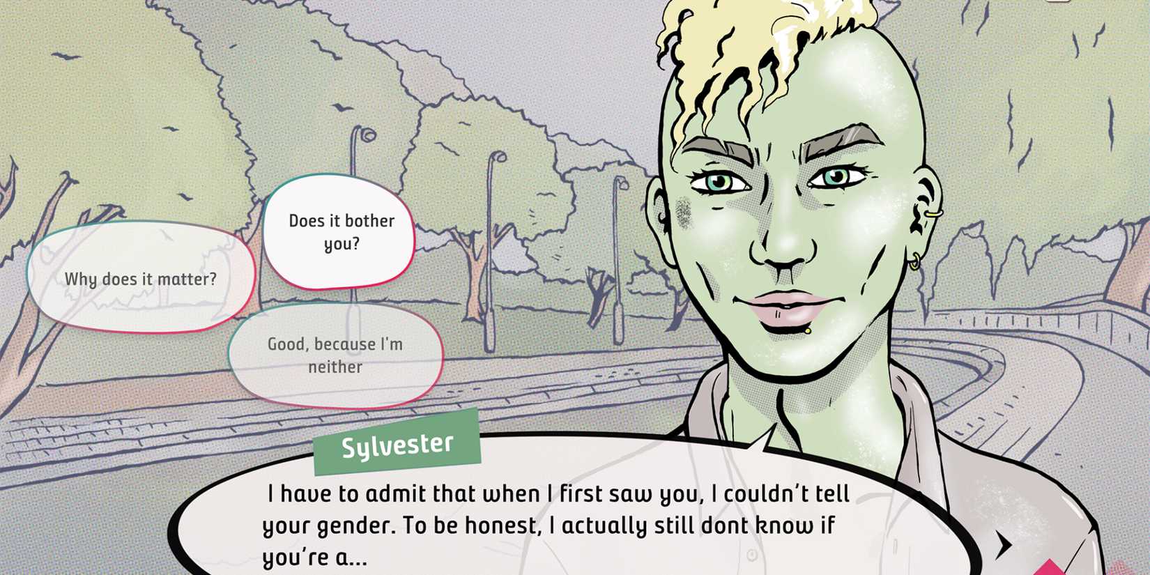 Para un juego que hace un trabajo tan bueno al incluir identidades LGBTQ+, Estaba un poco decepcionado en Más cierto que tuLa decisión de dar a sus personajes colores de piel antinaturales como verde o azul. Presentar el color de la piel como un rasgo puramente fenotípico e ignorar el impacto que la construcción sociopolítica de la raza tiene en las personas de color, se siente extrañamente regresiva aquí. No puedo evitar sentir que Más cierto que tu se beneficiaría de reconocer identidades que se cruzan, en lugar de adoptar este enfoque de color ciego.