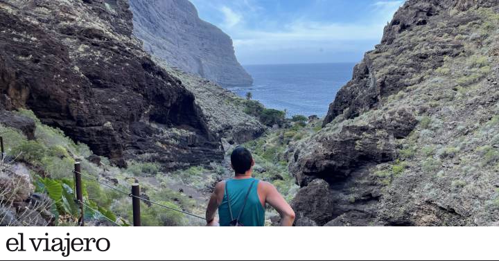 Los bellos caseríos que desafían la verticalidad de la zona atrajeron primero a escaladores y aficionados al senderismo. “El turismo fuerte arrancó en torno al año 2000. De ser una zona poco conocida se convirtió en el segundo enclave más visitado de la isla solo por detrás del Teide”, explica Manuel García, agente medioambiental del Teno. De recibir un puñado de caminantes y aficionados a la montaña, Masca pasó a acoger a casi un millón de visitantes al año. “Una presión muy alta para un ecosistema como este”, apunta. También un riesgo para los que se aventuraban a surcar el escarpado recorrido que concentraba rescates e incidentes. El barranco cerró al público. Tres años después de la clausura, y una inversión que roza el millón de euros para acondicionar el itinerario, el pasado 27 de marzo el barranco de Masca recibió a sus primeros visitantes. El paseo arranca con una empinada bajada de unos 200 metros (a la vuelta se convierte en uno de los tramos más exigentes) que desemboca en el lecho del cortado por el que corre un fresco aire matutino. Si desde lo alto se avista el perfil de La Gomera sobre el mar, una vez dentro del barranco las imponentes paredes verticales le dan a uno la sensación de haber menguado hasta convertirse en un ser minúsculo.