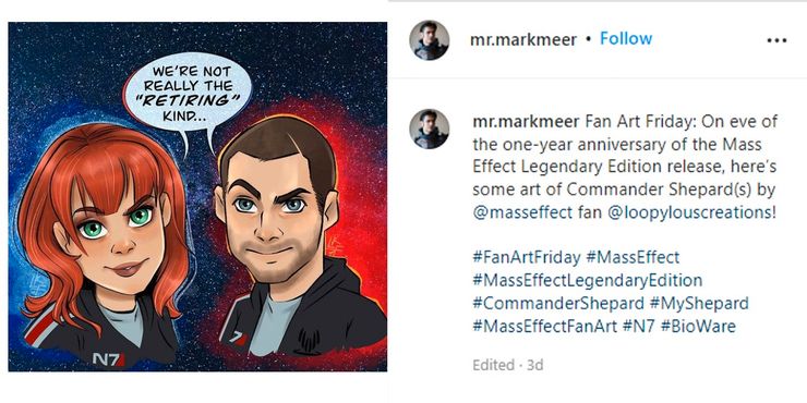 A pesar de esto, muchos todavía tienen la esperanza de que Shepard regrese. efecto de masa 4. Estas esperanzas han ido creciendo después de una publicación de Instagram del actor masculino de voz de Shepard, Mark Meer (a través de cómic). La descripción de la publicación simplemente celebra el primer aniversario de Mass Effect: Edición legendaria, pero la imagen en sí es más sustantiva; la imagen que acompaña a la descripción es una obra de arte que presenta las versiones masculina y femenina de Shepard, con una burbuja de texto que dice: “No somos realmente del tipo ‘jubilado’.”