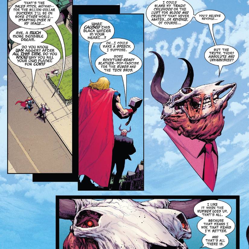 Desde la épica de Jason Aaron Thor Run (a partir de 2012, y presentando a Gorr el Butcher Gorr), Roxxon y su CEO Dario Agger han sido una gran espina en el lado de Thor. Sin embargo, como Dios del trueno, él era la figura más poderosa en su conflicto, con la amenaza de Roxxon proveniente de cómo dañaron el medio ambiente y las personas inocentes cuando Thor no pudo detenerlos. Como un hombre normal, Ahora es el desvalido luchando contra una corporación gigantesca (y su líder, que puede convertirse en un minotauro).
