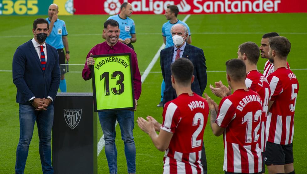 Herrerín, que ayer saltó al césped escoltado por Iribar e Iraizoz en medio de un pasillo de honor formado por su compañeros para recibir un cuadro con una camiseta con el número 13, fue el portero titular del Athletic en el primer partido oficial disputado en el nuevo San Mamés el 16 de septiembre de 2013, partido que concluyó con triunfo rojiblanco frente al Celta por 3-2. Su bagaje como león incluye la participación en 119 encuentros oficiales, con cesión al Leganés en a mitad de la campaña 2016-17 incluida, y dos Supercopas.
