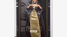 El diseñador Carlyle Nuera, Jefe de Diseño de Barbie Signature en Mattel, vistió a la muñeca con un brillante vestido dorado y negro acentuado por una larga cola de tul.