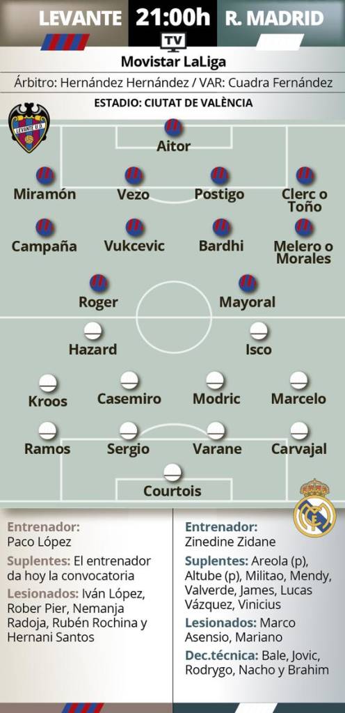 El Levante, por su parte, tratará de sorprender al Real Madrid después de haber perdido en Villarreal en la última jornada. El entrenador Paco López, tiene las bajas por lesión de Iván López, Rober Pier, Nemanja Radoja, Rubén Rochina y Hernani Santos. La ausencia de Rochina sería cubierta por Gonzalo Melero, formado en las categorías inferiores del Real Madrid, o con la presencia de José Luis Morales en el centro del campo en una variante de carácter algo más ofensiva. Otra de las incógnitas es lateral zurdo, ya que Toño García perdió el puesto el pasado sábado y Carlos Clerc cuajó un buen partido ante el Villarreal, mientras que en el resto de la defensa no se esperan cambios y Miramón, Vezo y Postigo completarán la zaga.