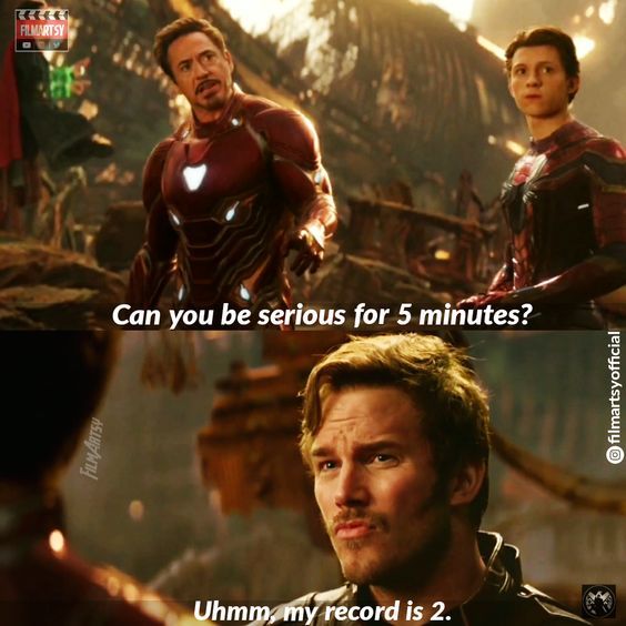 La paciencia de Iron Man se puso a prueba cuando estaba tratando de idear un plan con Peter Parker, Star-Lord, Drax y Mantis, pero nadie podía tomarlo en serio, especialmente Star-Lord. El futuro del universo estaba en sus manos y estaban a punto de enfrentarse a Thanos, sin embargo, Quill siempre encontraba un momento para comentar al respecto. Sin piedad o insiste en que era mejor inventando planes.
