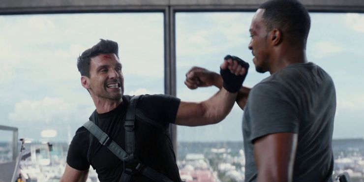Cuando Sam sube para interceptar a Rumlow en el Triskellion, Rumlow logra dominar a Sam el tiempo suficiente para dar un discurso grande y poderoso sobre cómo la guerra solo viene con dolor.