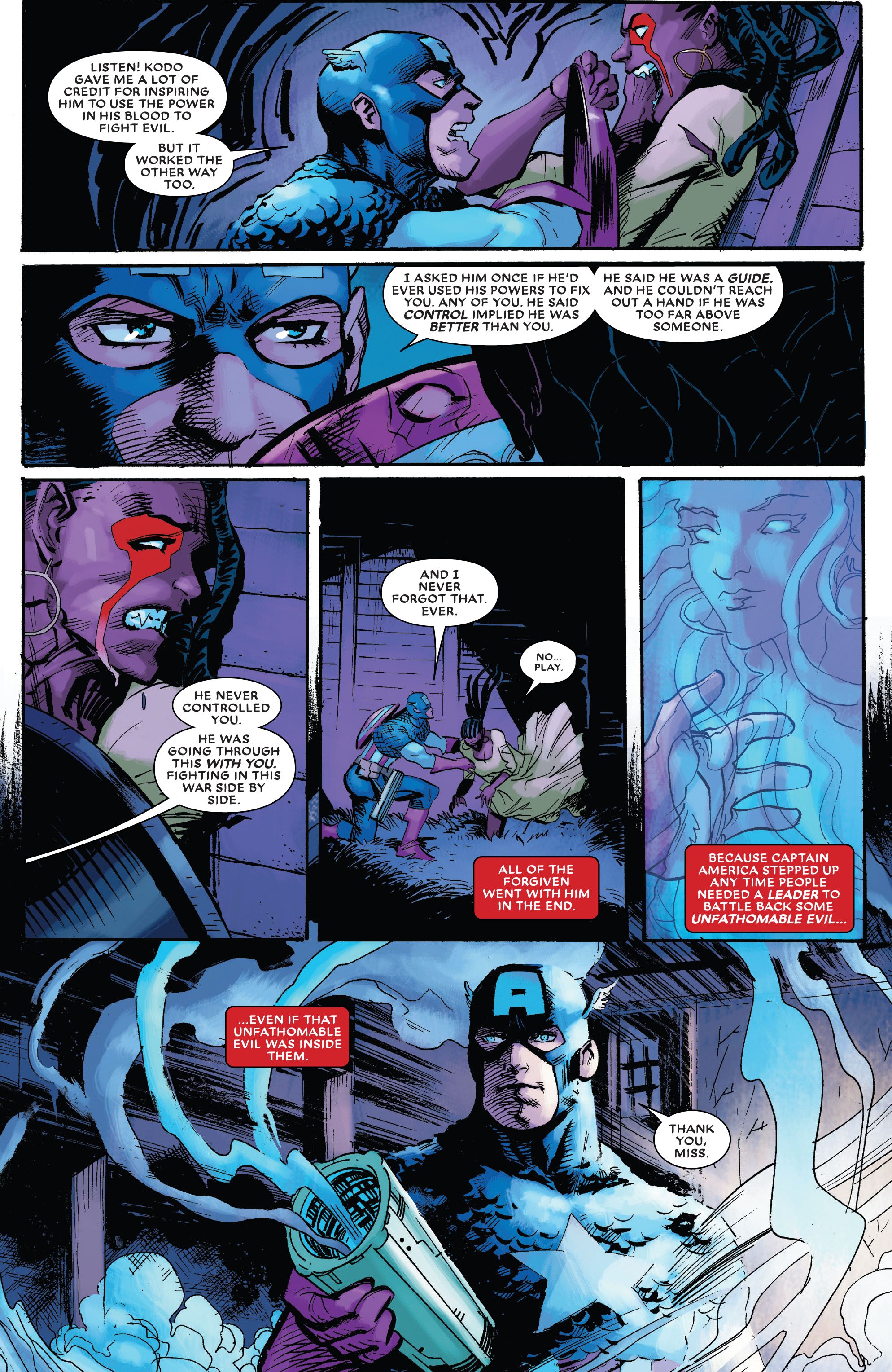 La historia, titulada “Algunos monstruos buenos”, está escrita por Tim Seeley, dibujada por Sid Koitan, coloreada por Edgar Delgado y con letras de Joe Caramagna. The Forgiven, un equipo de vampiros rebeldes que se resisten a su sed de sangre, acaba de ser traicionado por uno de los suyos: el nuevo vampiro Redblood. El equipo ha jurado traer a Redblood, y después de luchar junto a los X-Men, viajan a una de sus antiguas bases, que les dio el Capitán América. Redblood revela que su nombre de vampiro se inspiró en el Capitán América; ella ve a Cap como “de voluntad fuerte” y “enérgico”—cualidades que vio en sí misma. Más tarde, el Capitán América acorrala a Nighteyes, uno de los Perdonados. Mientras intenta calmar la situación, el Capitán América le dice a Nighteyes que el líder ahora fallecido de Forgiven, Raizo Kodo, fue inspirado por Cap para usar su sed de sangre para luchar contra el mal. El Capitán América le dice a Nighteyes que Kodo estaba tratando de ser una guía y no controlarlos. Nighteyes se retira y Redblood revela que Cap acudió a otros miembros de Forgiven, tratando de reunirlos para luchar, y todos siguieron su ejemplo.