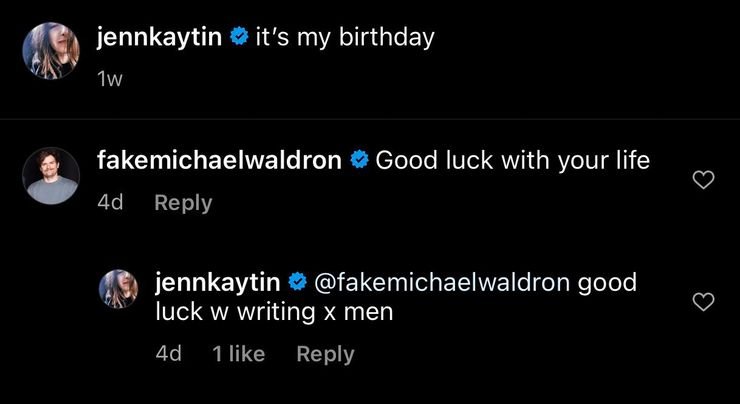 Para celebrar su cumpleaños, Thor: amor y trueno la coguionista Jennifer Kaytin Robinson recurrió a Instagram para compartir un puñado de imágenes de su rollo de cámara. Loki y Doctor extraño en el multiverso de la locuraMichael Waldron respondió a la publicación de Robinson con un mensaje descarado de “buena suerte con tu vidaa lo que el compañero escritor de Marvel respondió con “Buena suerte escribiendo x men”, haciendo referencia a la LA Times‘ La historia de April Fools en la que se decía que Waldron estaba escribiendo el X Men película mientras que Zack Snyder la dirigiría. Mira una captura de pantalla de la interacción a continuación: