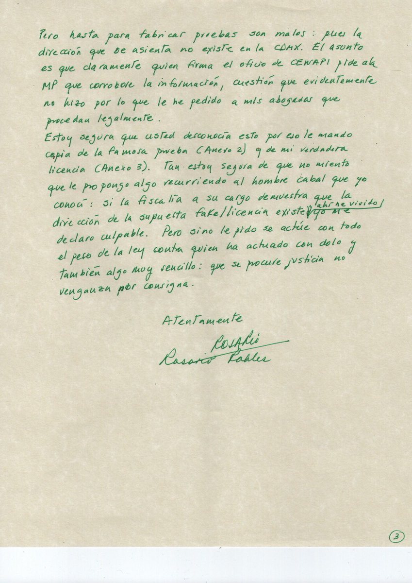 “Si la fiscalía a su cargo demuestra que la dirección de la supuesta ‘fakelicencia’ existe y que yo he vivido ahí, me declaro culpable. Pero si no, le pido se actúe con todo el peso de la ley contra quien ha actuado con dolo, y también algo muy sencillo: que se me procure justicia, no venganza por consigna“, escribió Robles, presa en el penal de Santa Martha Acatitla.
