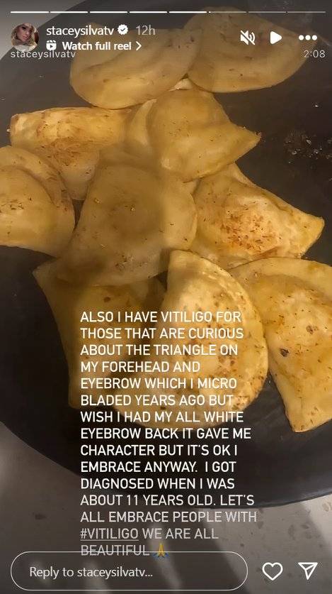 En una historia reciente de Instagram, Stacey dirigido fanáticos que tenían curiosidad por el “triángulo” en su frente y cejas, explicando que tiene vitiligo. También mencionó que microbladía su ceja hace años para encubrir la condición. Stacey agregó, “Pero desearía que tuviera mi ceja blanca de vuelta, me dio carácter”. A pesar de esto, no tiene reservas y abraza completamente su condición de piel. Concluyó su mensaje alentando a todos, declarando, “Agradecemos a las personas con #Vitiligo. Todos somos hermosos”.