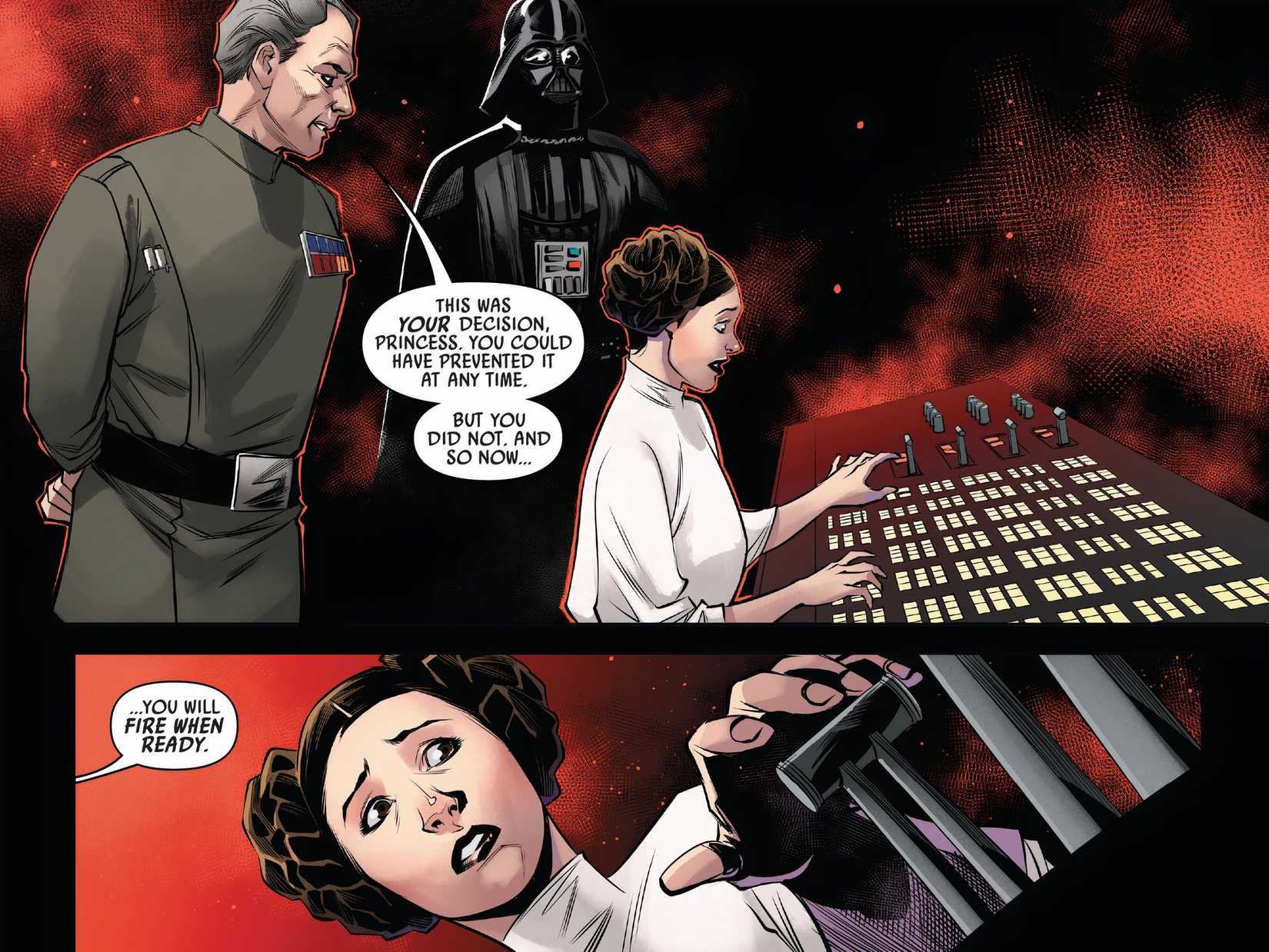 - La princesa Leia se culpa a sí misma y a las tácticas despiadadas del Gran Moff Tarkin más que a Darth Vader por la destrucción de Alderaan.