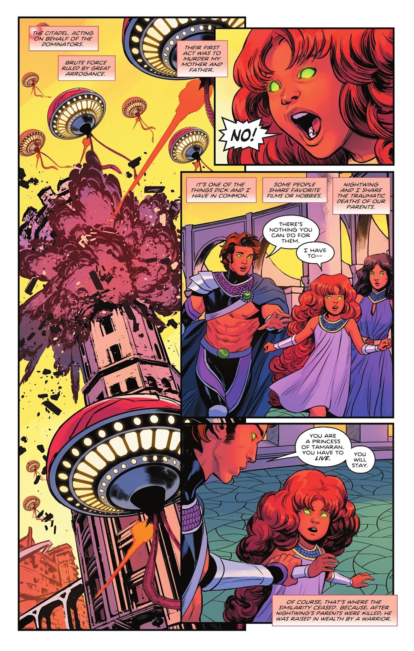 “/> El comienzo de Titanes El número 6 se centra en Starfire en su planeta natal Tamaran, recordando sus humildes comienzos cuando era niña, todo mientras la actual Kory narra. Recuerda que su madre y su padre, el Rey y la Reina, fueron llamados a la Cámara del Consejo en lo que comenzó como un día normal. El día se descarrila rápidamente cuando el planeta es invadido por la Ciudadela, que asesina a sus padres en cuestión de segundos, junto con muchos otros tamaraneanos. Gran parte de la terrible experiencia también reduce a cenizas los puntos de referencia del planeta.