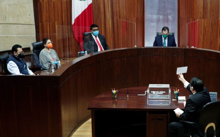 En la sesión encabezada por el magistrado presidente de la Sala Superior del TEPJF, José Luis Vargas Valdez, realizada en el salón de plenos, el secretario general de Acuerdos, Carlos Vargas, colocó en una urna seis tarjetas en blanco y una con el nombre de la gubernatura impugnada.