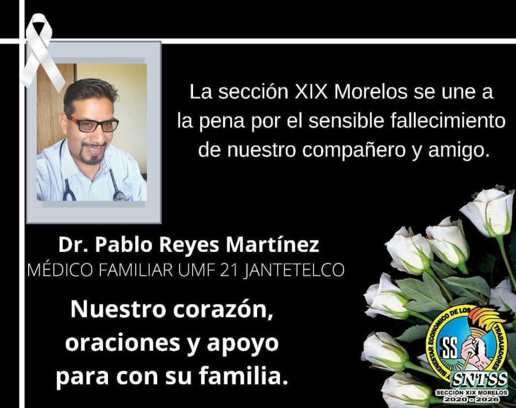 “Nos unimos a la pena que embarga a la familia de Pablo Reyes Martínez, quien cumpliendo con el amor a su profesión fue contagiado por sus pacientes por Covid-19”.