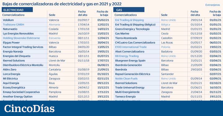 Las cotizaciones récord de la energía registradas en los últimos meses (el mercado mayorista de la electricidad se situó el sábado en 223,36 euros/MWh y el del gas, en 90,97 euros/MWh), se ha saldado con la baja de 26 comercializadoras eléctricas y 24 de gas desde que comenzó 2021 hasta hoy, según los listados de la CNMC. La mayoría de ellas se concentran en los últimos meses del año pasado y, muy especialmente, en enero. Aunque en algunos casos la CNMC ha instado la inhabilitación por no comprar la energía comprometida con sus clientes, en muchos otros se trata de bajas voluntarias que las compañías solicitan en el registro del regulador.