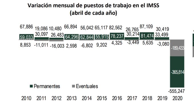 El instituto reportó que “al 30 de abril de 2020 se tienen registrados ante el Instituto Mexicano del Seguro Social (IMSS) 19,927,696 (diecinueve millones novecientos veintisiete mil seiscientos noventa y seis) puestos de trabajo; de éstos, el 86.4% (ochenta y seis punto cuatro por ciento) son permanentes y el 13.6% (trece punto seis por ciento) son eventuales. En los últimos años, estos porcentajes se han mantenido relativamente constantes”.