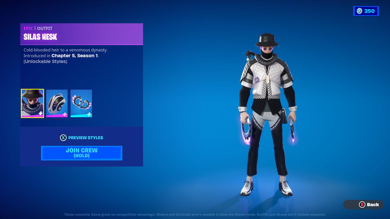 “/> A través del sitio web oficial de Fortnite, Silas Hesk es el atuendo de personaje destacado para el Crew Pack de este mes. El traje de Silas Hesk también viene con El Back Bling Serpentine y los Colmillos de Hesk Pickaxe, completando un conjunto completo de cosméticos de personajes.