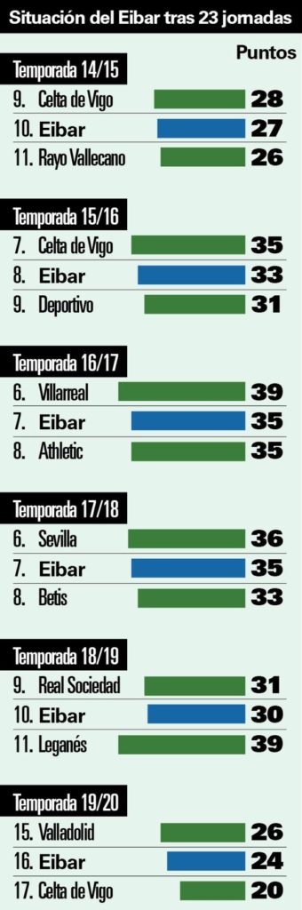 De hecho, es la primera vez que el Eibar no se sitúa entre los diez primeros clasificados a estas alturas de curso. Incluso en su primera campaña en la categoría, en la que el conjunto dirigido entonces por Gaizka