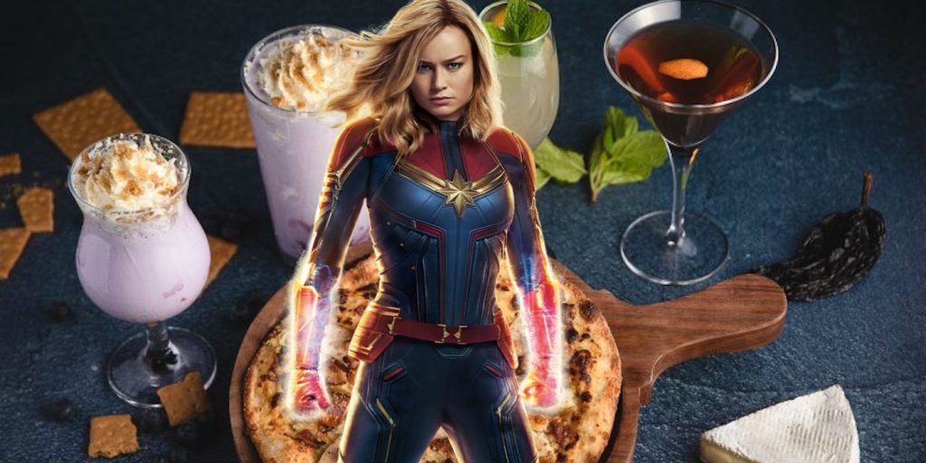 Cines creativos han saltado rápidamente en el Capitán Marvel Vagón, elaboración de bebidas y platos inspirados en la película. Alamo Drafthouse Cinema tiene una pizza de Brie binario, que se describe como “Femenina y atrevida”. El teatro también está sirviendo dos Capitán Marvel-cócteles temáticos, así como un batido conocido como el Batido de nuestro ancestro azul. Mientras tanto, los teatros de AMC ofrecen un par de "cócteles maravillosamente mezclados", bautizados como Supernova y Mach 3. El cine Nitehawk de Brooklyn también tiene una oferta especial de comidas y bebidas. Su menú incluye un Skrull Donut, que aparece como "Buñuelo salado que cambia de forma". Su pareja sugerida es con el cóctel Por el bien de todos Kree.