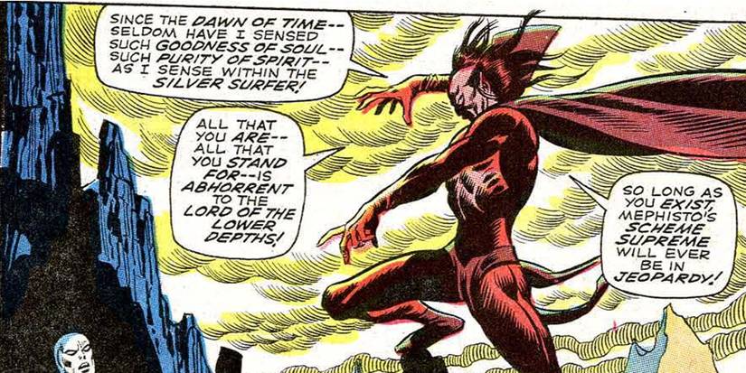Surfista de plata #3 de Stan Lee y John Buscema marca la primera aparición de Marvel de Mephisto. En su debut en el cómic en panel, Mephisto espera destruir la única figura de pura bondad caminando en un planeta lleno de humanidad cuyo odio desea explotar. Cuando no puede corromper Silver Surfer con tentaciones, trata de aplastarlo tanto física como emocionalmente, este último secuestrando a su trágico amante, Balla-Bal. Este momento establece efectivamente un facsímil satánico que se ajusta dentro del mito de Marvel. Inicialmente, está destinado a formar parte de la galería de Rogue de Silver Surfer, pero finalmente teje hacia otros héroes.