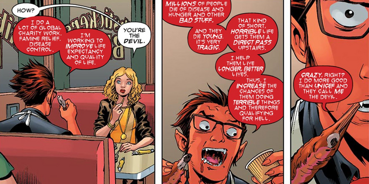Mephisto le dice a Amara que, “Hago mucho trabajo de caridad global. Alivio del hambre, control de enfermedades. Estoy trabajando para mejorar la esperanza de vida y la calidad de vida.Magma está confundido, expresando sorpresa ya que él es el Diablo, pero Mephisto continúa ofreciendo una explicación muy razonable, aunque insidiosa, de su trabajo caritativo. Explica que millones de personas mueren jóvenes a causa de cosas horribles como enfermedades y desastres naturales, y si mueren jóvenes, entonces él no tiene la oportunidad de corromperlos y tomar sus almas. Mefisto sí “.Más bueno que UNICEF”, pero todavía se le llama el Diablo, lo cual tiene sentido porque no está haciendo la caridad para ayudar a las personas, sino para aumentar las probabilidades de que obtenga más de sus almas más adelante en la vida.