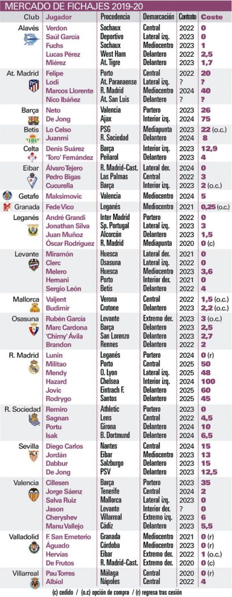 Desde hoy y hasta el lunes 2 de septiembre estará abierto el mercado de fichajes en España. Dos meses en los que la mayoría de los clubs darán la vuelta al calcetín a sus respectivas plantillas con el objetivo de alcanzar los objetivos al final del curso. La ventana estival promete ser apasionante, y más si se tiene en cuenta lo que ya se lleva invertido cuando aún no se había dado el pistoletazo oficial. El mercado 2019-20 apunta a histórico, pues todo hace indicar que se batirá el récord de mayor gasto en contrataciones. El mismo data del año pasado, cuando se acabaron desembolsando 866 millones de euros. En el actual, el que hoy comienza, los clubs ya llevan gastados más de 680 ‘kilos’, una cifra superior a todos los mercados anteriores al verano de 2018.