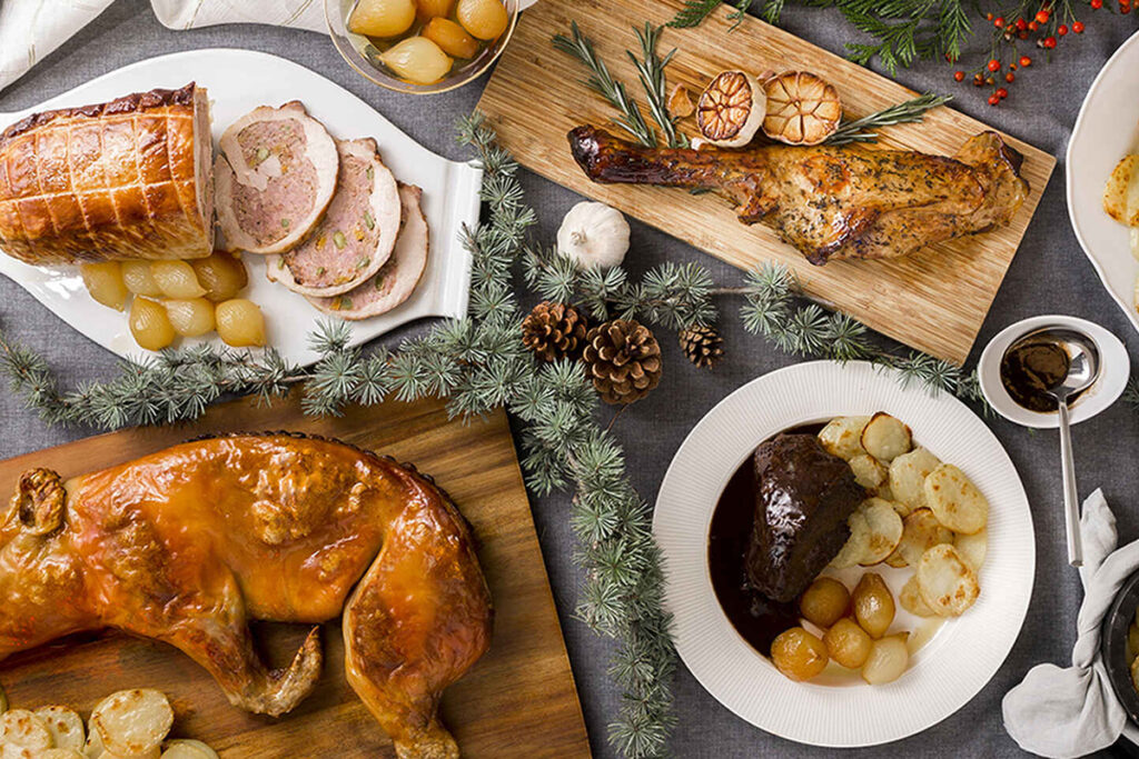 En total, Mercadona ofrece seis platos en su menú navideño. Cinco de ellos como parte principal de la comida o cena y un surtido de canapés. Todos ellos incluyen una guarnición de patatas panaderas y cebolla confitada. Los platos se entregan envasados en cajas de cartón y presentados sobre sobre unas bandejas con motivos navideños, de las que hay que retirarlos para introducirlos en las fuentes aptas para el horno. Todos ellos incluyen unas instrucciones de elaboración para darles el toque final en el domicilio, que se pueden consultar a través de un folleto disponible en tienda.