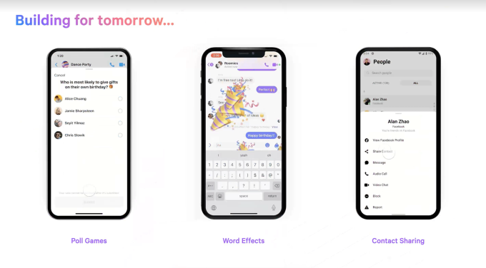 En cuanto a la cosecha de nuevas funciones de hoy, que incluyen encuestas, efectos de palabras, uso compartido de contactos y otras, el objetivo es celebrar la capacidad de Messenger para mantener a las personas en contacto con sus familiares y amigos.